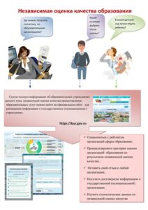 Оценить качество условий осуществления образовательной деятельности можно на официальном сайте для размещения информации о государственных (муниципальных) учреждениях. Ежегодно общественным советом при управлении образования и науки области проводится процедура независимой оценки качества условий осуществления образовательной деятельности образовательными организациями области.